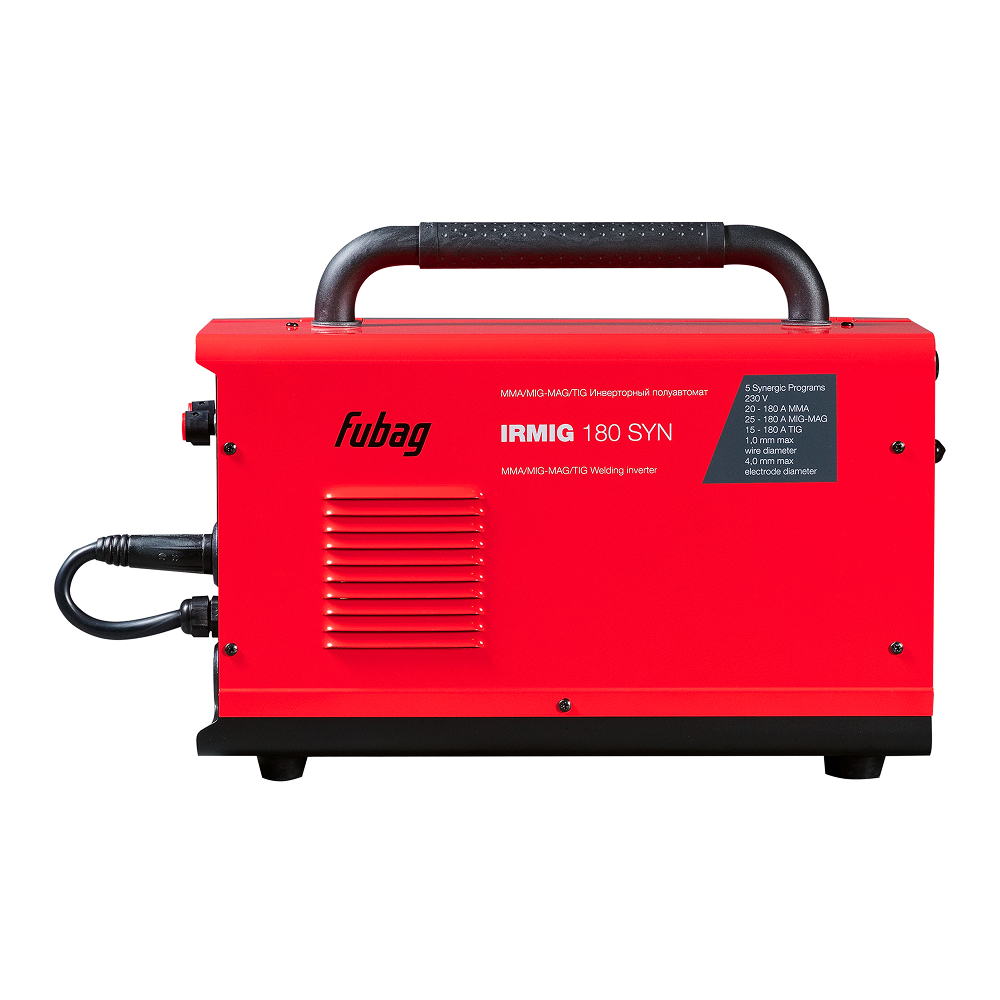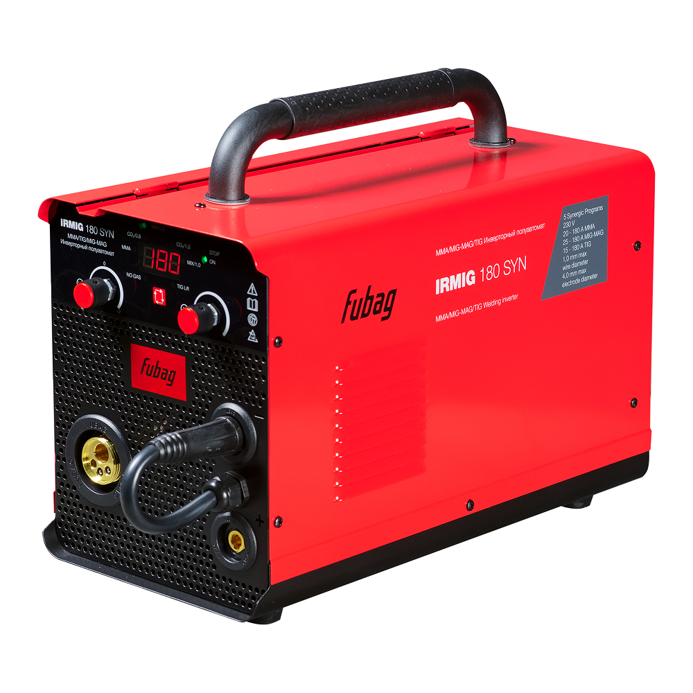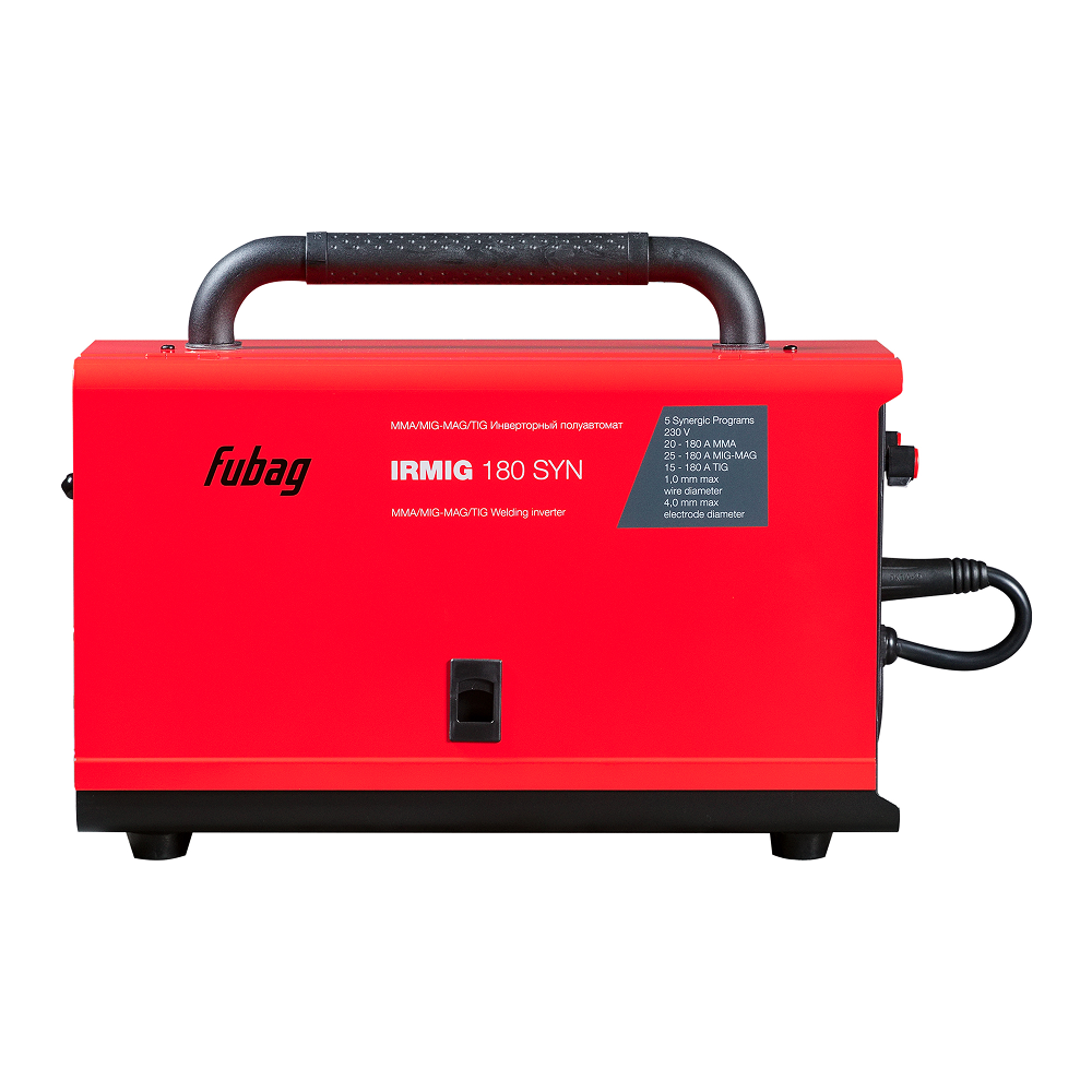Сварочный полуавтомат Fubag IRMIG 180 SYN – высокопроизводительный сварочный аппарат. Работает в режимах MIG/MAG, MMA, TIG LIFT DC. Имеет 5 встроенных синергетический программ . Аппарат работает в самом распространенном диапазоне сварочного тока 15-180 А с проволокой диаметром от 0,6-1,0 мм, катушкой весом 5 кг и диаметром 200 мм. Высокую производительность сварочной работы обеспечивает автоматическая подача проволоки. Регулировка подачи проволоки, сварочного напряжения и индуктивности в ручном режиме позволяет настроить оптимальный режим сварки. Передняя панель оснащена регуляторами силы тока и скорости подачи проволоки, что позволяет быстро и просто выбирать режимы и оптимальные параметры сварки. Сварочный полуавтомат Fubag IRMIG 180 SYN оснащен евроразъемом для быстрого и безопасного подключения сварочной горелки. Купив сварочный инвертор IRMIG 180 SYN, вы получите в коробке фирменную горелку 250 А и газовый шланг, а также кабель с электрододержателем и кабель заземления. Продолжительность включения (ПВ) составляет 20% при 40С. Эти данные приведены в соответствии с европейским стандартом EN60974-1 при внешней температуре 40С. Часто на рынке используется значение ПВ при температуре окружающей среды 20С: чем ниже температура, тем выше ПВ. Сварочный полуавтомат Fubag IRMIG 180 SYN обладает легкой сменой полярности для работы с самозащитной проволокой. Эффективная система охлаждения, а также встроенная функция термозащиты с индикацией перегрева гарантируют долговечность и надежность использования аппарата в условиях интенсивной эксплуатации. Быстрое подключение сварочных кабелей и евроразъем для подключения горелки гарантируют удобство использования. Все технические характеристики наглядно и подробно указаны на корпусе аппарата. Сварочный полуавтомат Fubag IRMIG 180 SYN поставляется с полным набором аксессуаров для MIG/MAG и ММА сварки . В интернет-магазине fubag.ru вы можете скачать инструкцию по подключению и использованию сварочного полуавтомата Fubag IRMIG 180 SYN, а также фотографии аппарата в различных ракурсах, его характеристики и полное описание.Основные преимущества полуавтомата сварочного FUBAG IRMIG 180 SYN