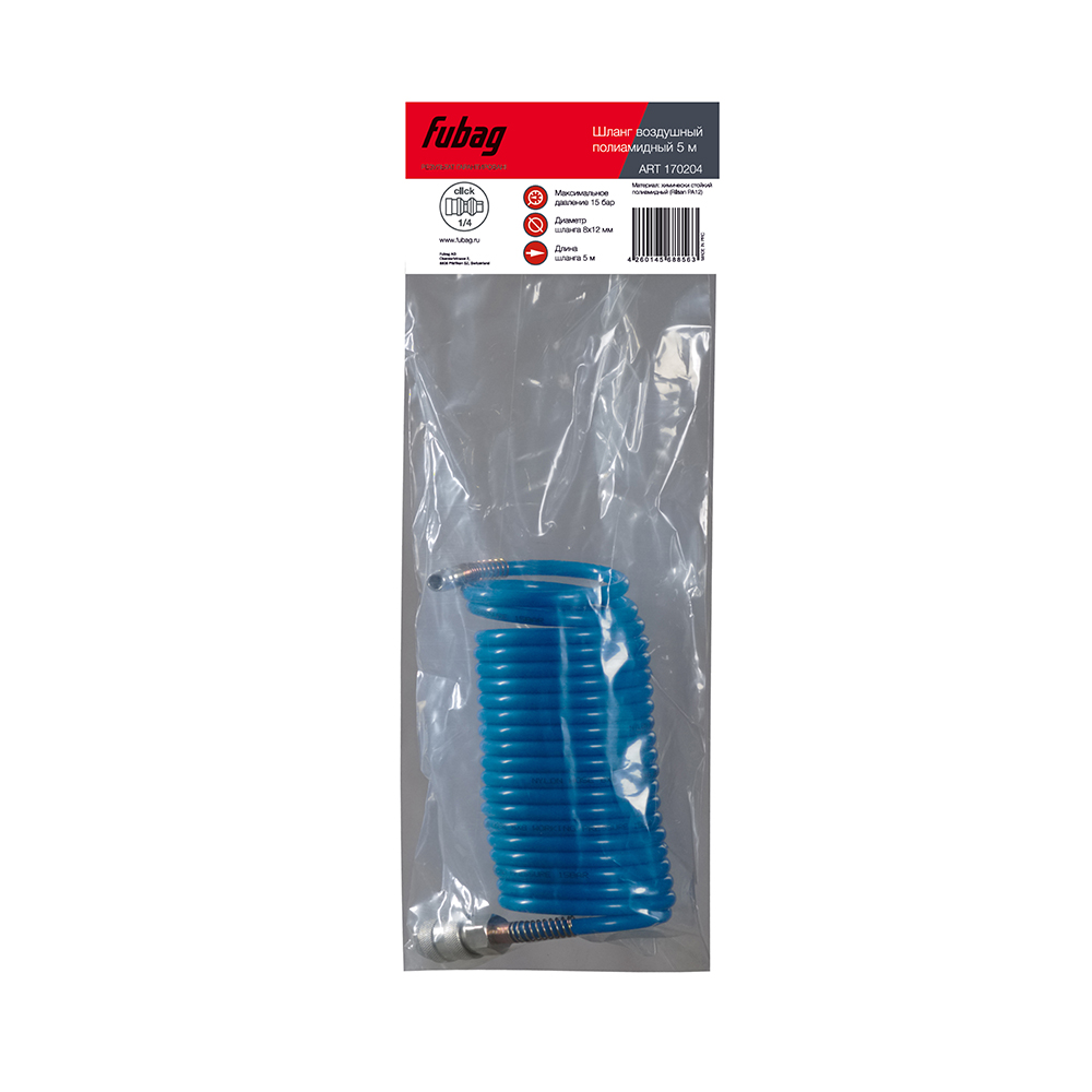Характеристики FUBAG Шланг спиральный с фитингами рапид химически стойкий полиамидный (рилсан) 15бар, 8x12мм , 5м
