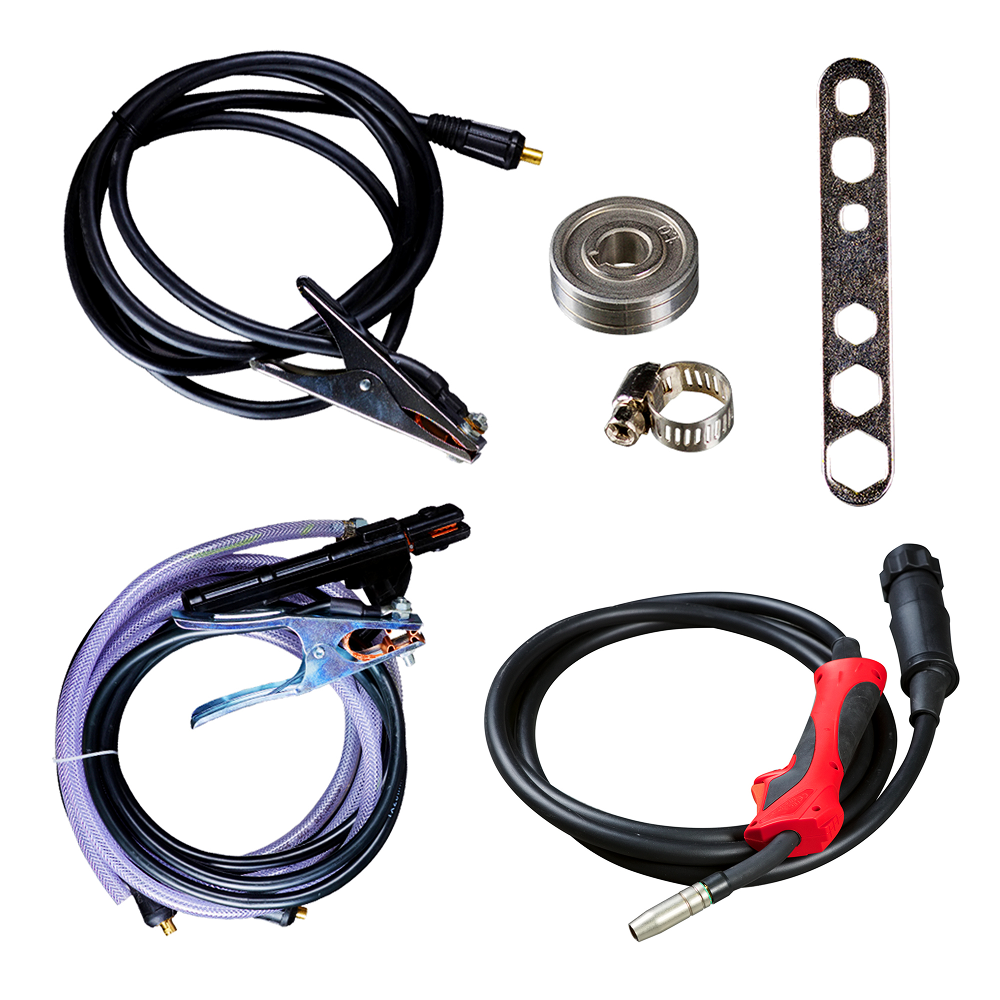 Горелка FB 150 3 метра, Кабель заземления 3 метра, Газовый шланг 3 метра, Электрододержатель 1,6 метра, Ролик 0,8-1,0, Хомут |